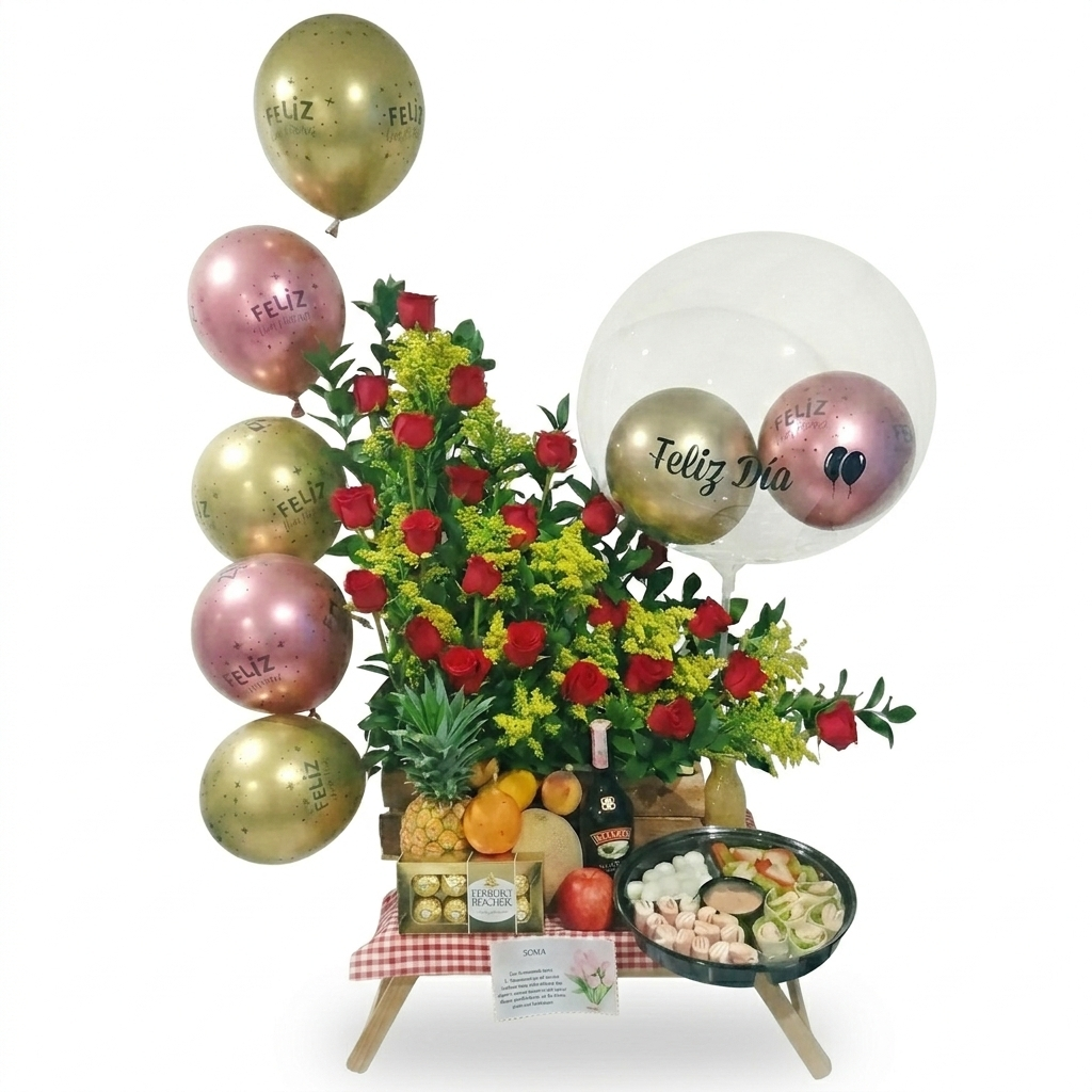 El regalo también incluye un hermoso arreglo floral que complementa la presentación general y se puede personalizar según los gustos y preferencias del destinatario. Finalmente, se agregan algunos globos para crear una atmósfera lúdica y alegre al regalo.